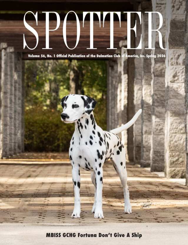 The Spotter is the official magazine of the Dalmatian Club of America. It is published quarterly. We publish information specific to the Dalmatian breed and the Dalmatian Club of America's club activities. Regional club's also provide information in this publication. We feature Dalmatian Club of America Members advertisments, and non-member advertisements are welcome as well.