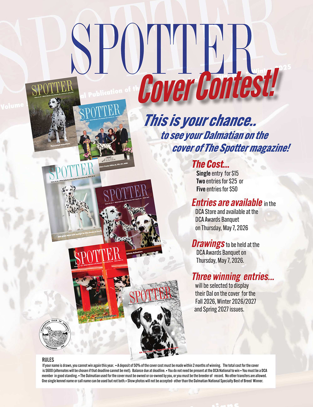 Each year at the Dalmatian Club of America National Specialty show a drawing occurs during the Awards Banquet. There will be three opportunities to advertise on a Spotter Issue Cover, with your purchase of said cover. One cover is automatically reserved for the National Specialty Best of Breed Winner.